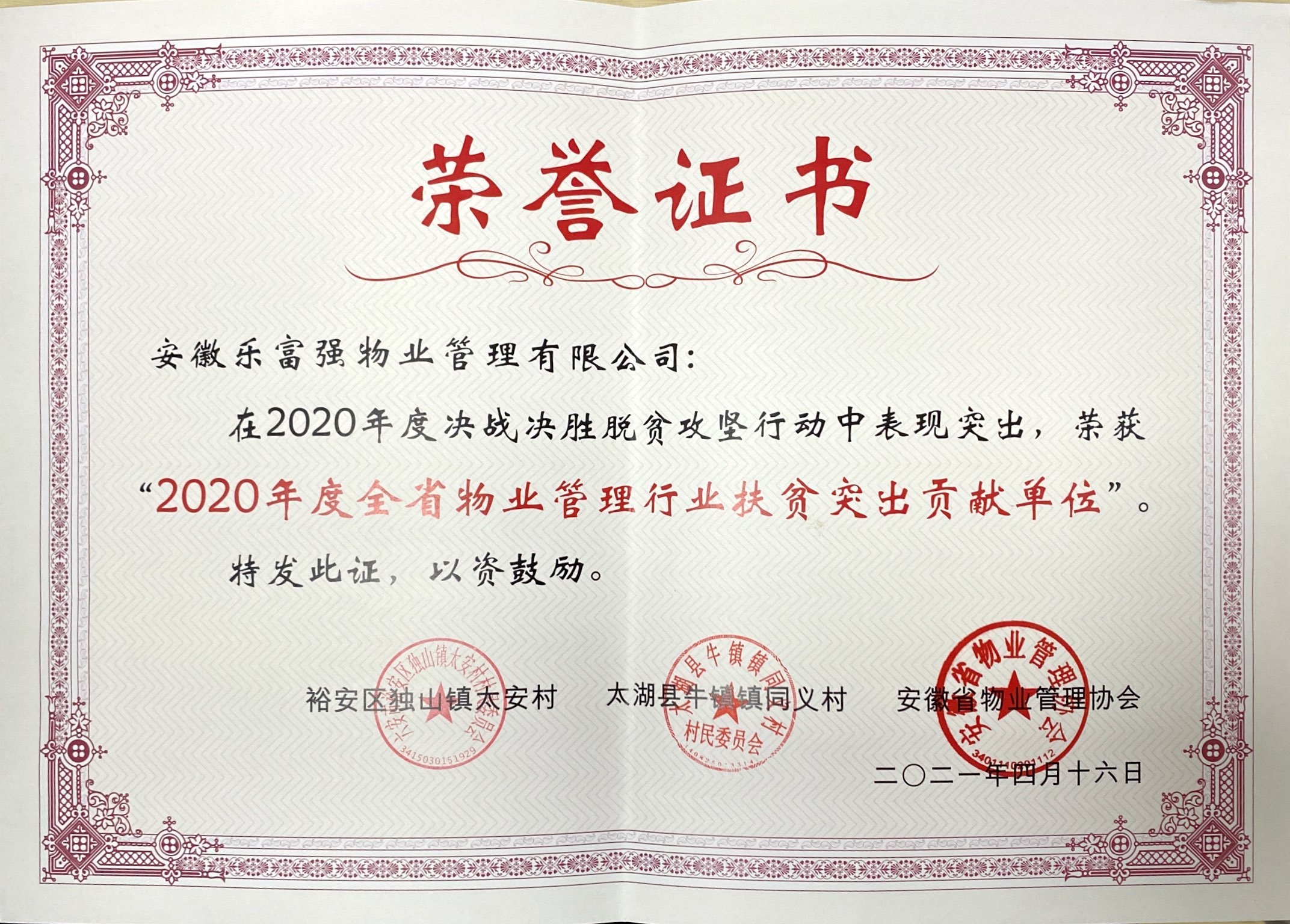 每一份荣誉,,,,,都是砥砺前行的力量;;;;;;;;每一步前行,,,,,都会拉近与幸福的距离。。。。。在不平凡的2020年,,,,,大丰国际物业积极肩负社会责任,,,,,发挥带头作用,,,,,对协会开展的疫情防控、党建工作、行业交流、专业培训、课题研究、会务组织、物博会、公益扶贫等各项工作予以鼎力支持,,,,,被大会授予“2020年度安徽省物业管理协会优秀会员单位”称号。。。。。