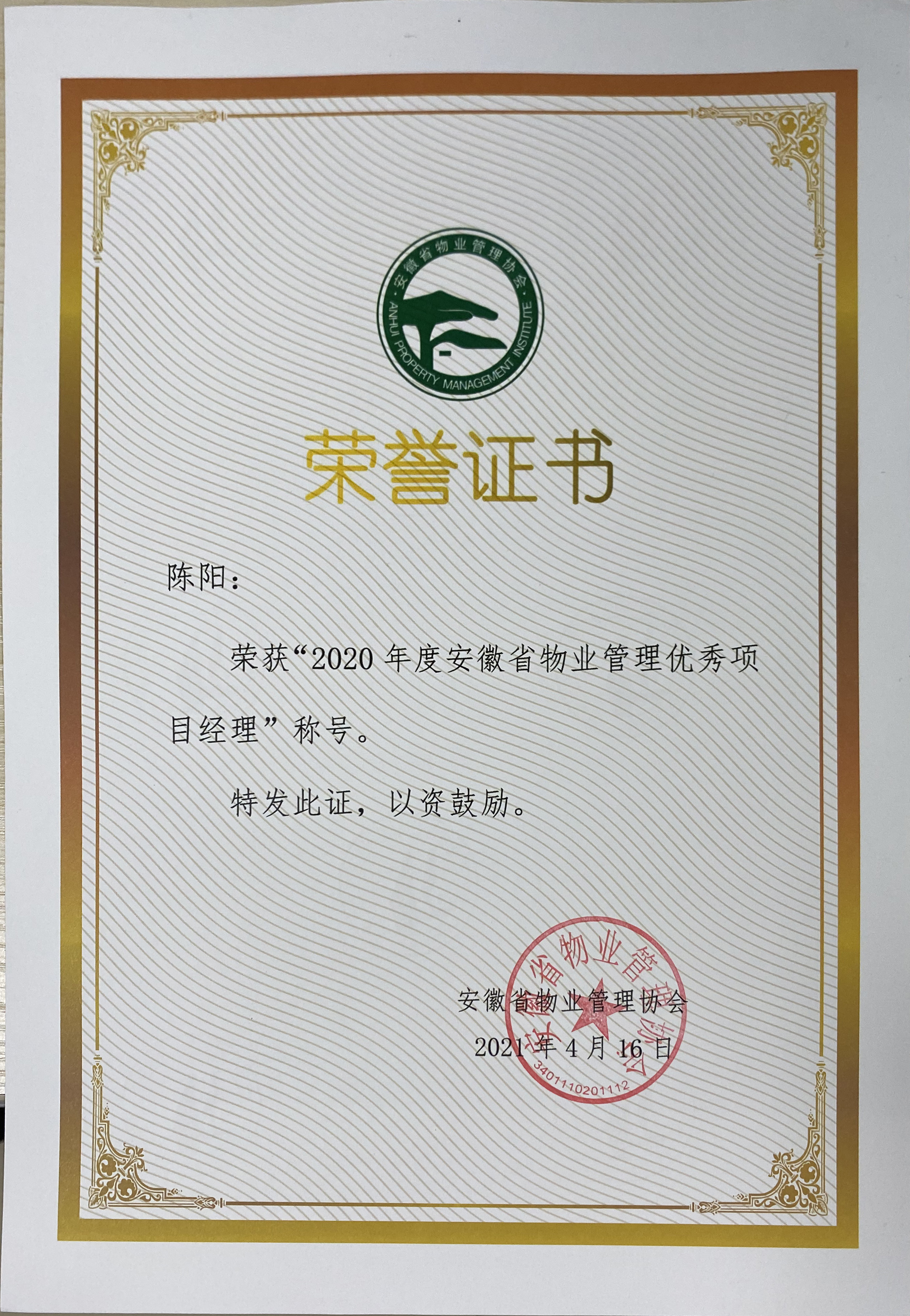 大丰国际物业项目经理陈阳在疫情防控、防汛抗洪、文明创建等一线工作中身先士卒、敢于担当,,,,,在工作岗位上充分发扬爱岗敬业的优良作风,,,,,被大会授予“2020年安徽省物业管理优秀项目经理”荣誉称号。。。。。